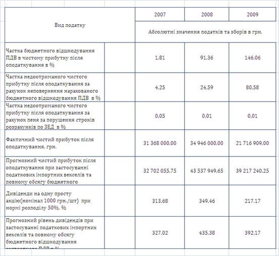 - прогнозний чистий прибуток після оподаткування за 2009 рік при застосуванні податкових імпортних векселів та повному обсягу бюджетного відшкодування з рівня 21,716 млн.грн. зросте до рівня 39,21 млн.грн.;