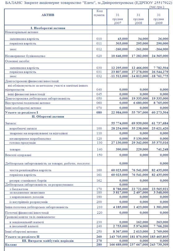 Баланси ЗАТ „Едем” за 2007 -2009 роки