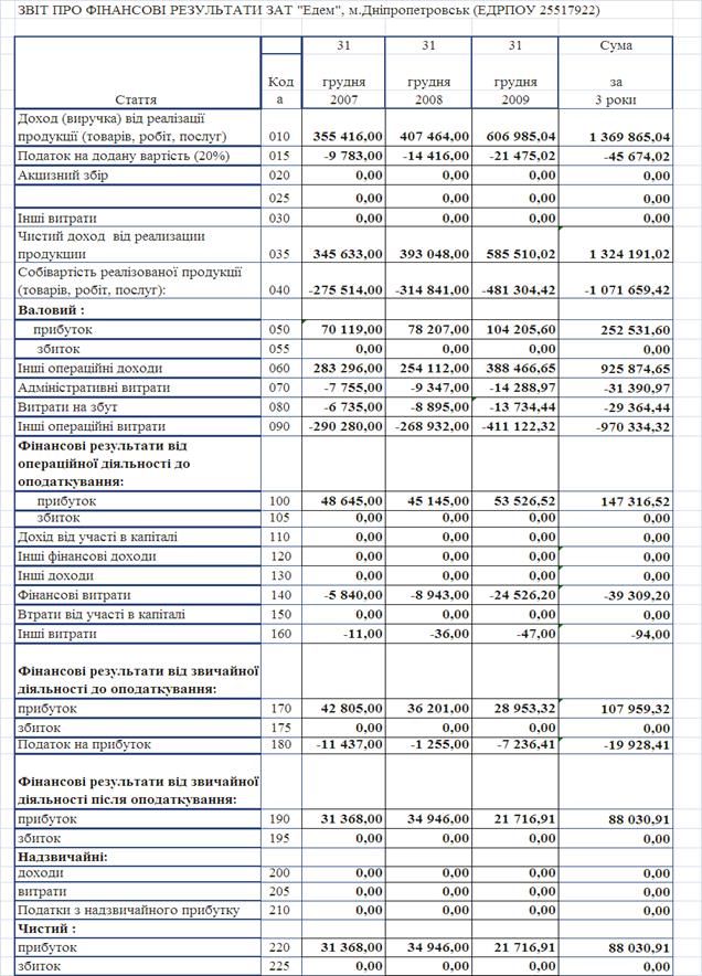 Звіти про фінансові результати діяльності ЗАТ „Едем” у 2007 – 2009 роках