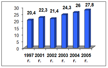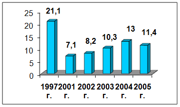 Как видно из таблицы наблюдается устойчивый рост доли продукции сельского хозяйства личных подсобных хозяйств в производстве всей валовой продукции сельского хозяйства. Если доля продукции сельского хозяйства личных подсобных хозяйств в 1970 году составляла 31,4 %, то к 1985 году произошло сокращение до 23,1 %. Затем с 1990 года начинается ее рост, который составил в 1990 году – 26,3 %, в 2000 году – 53,6 % и в 2003 году – 57,9 %.