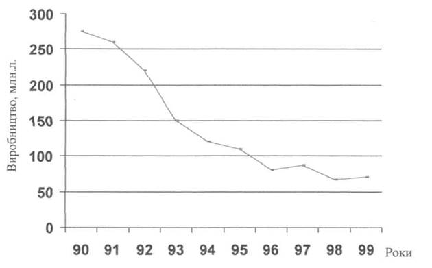 Причини зниження виробництва: низька купівельна спроможність населення, наявність ринку дешевого міцного алкоголю, фальсифікату і контрабанди, втрата минулих ринків збуту (головним чином російського).