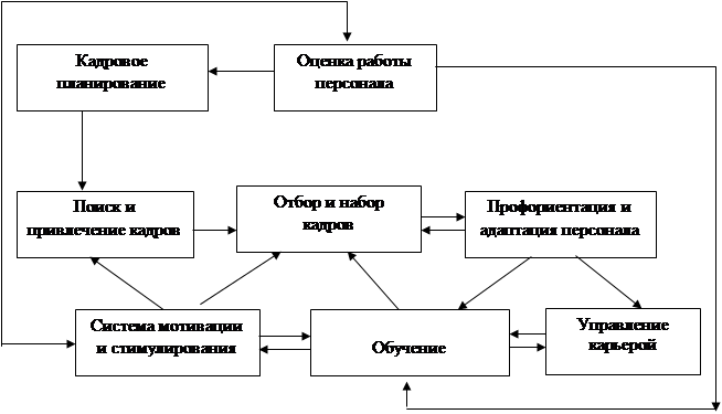 В настоящее время система управления персоналом организации включает следующие подсистемы: анализа рабочих процессов и их планирования; планирования использования людских ресурсов; набора, отбора и ориентации работников; оценки выполнения, практического обучение и повышения квалификации, продвижения; компенсаций и пособий; безопасности и здоровья; трудовых отношений; дисциплины, контроля, оценки действий персонала; расписания (графика) работы.