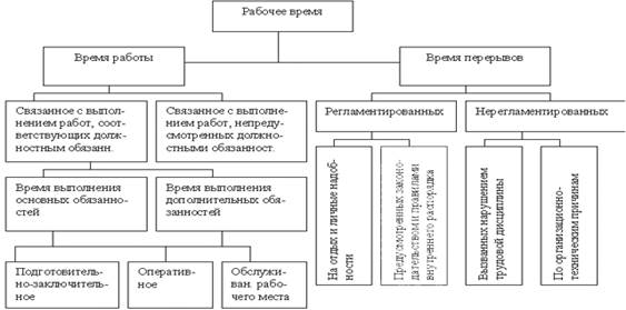 Время работы складывается из времени, идущего на выполнение производственного задания, а также на выполнение работ, не обусловленных заданием (излишнее время). Время работы, связанное с выполнением производственного задания, делится на подготовительно-заключительное оперативное (основное плюс вспомогательное) и время обслуживания рабочего места (техническое и организационное). Перерывы в работе могут быть двух видов: регламентированные (необходимые) и нерегламентированные (лишние).