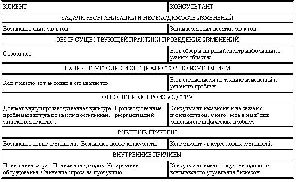 Поскольку что такое консалтинг, наши управленцы представляют смутно, спрос на услуги консультантов неквалифицированный. Проблема консультант - клиентских взаимоотношений — неспособность руководителя предприятия сформулировать задачу. То есть, ясно, что проблема есть. Снизился спрос на продукцию, нужно «нормализовать» налогообложение, отсутствуют средства на развитие и т. д.