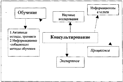 Международный опыт показывает, что преуспевающие корпорации с сильным руководством сделали регулярное обращение к консультантам нормальной практикой. В основном консультанты получают заказ (или задачи) на исправление тех ошибок, которые были допущены ранее; на усовершенствование какой-либо системы; на создание какого-либо нового продукта, под который есть идея. Консультирование как метод вмешательства и оказания услуг включает в себя процесс обучения, научные исследования и информационные услуги. Оно бывает экспертное и процессное (схема ).
