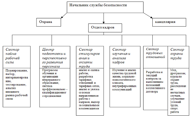 Вместе с тем намечаются положительные тенденции, в частности преобразование отделов кадров в отделы управления персоналом, правда, пока с незначительной трансформацией функций, что, естественно, существенно не сказывается на эффективности работы с персоналом. Другие предприятия идут значительно дальше и подчиняют управляющему по кадрам не только такие традиционные управленческие структуры, как отдел кадров, отдел подготовки кадров (или отдел технического обучения), но и социологические подразделения (если они имеются), отдел труда и заработной платы (предварительно передав планирование основных трудовых показателей в экономический отдел), отдел (лабораторию) НОТ и др.
