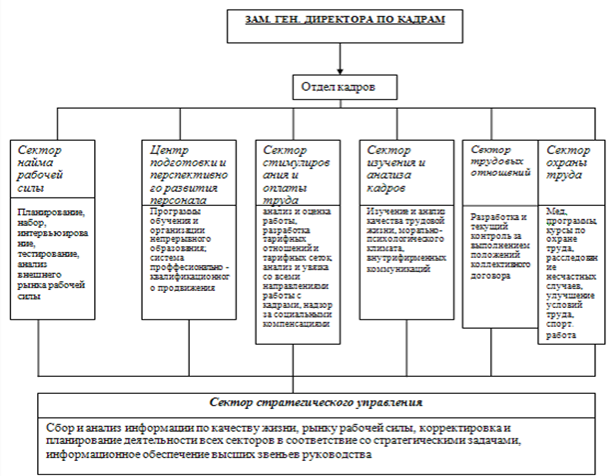 Кадровая служба не была наделена функциями планирования, организации, координирования, стимулирования, контроля, не участвовала в выработке кадровой политики, ограничиваясь текущей работой с кадрами. По сути дела, на большинстве отечественных предприятий и самой кадровой службы как совокупности взаимосвязанных структурных подразделений, участвующих в управлении персоналом, не было. Появление в последние годы должности заместителя генерального директора по кадрам не спасло ситуацию, так как ему, как правило, подчинялись лишь отдел кадров, отдел подготовки кадров и помощник директора по быту. Вне поля его деятельности оставались другие отделы предприятия, занятые выполнением порученных им функций в соответствии с собственным пониманием задач управления персоналом.