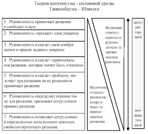 Большое распространение и популярность в литературе об управлении имеет классификация поведения руководителя на основе обоих стилей руководства - авторитарного и кооперативного. Именно такую классификацию предложили Танненбаум и Шмидт, в теории сплошной среды (континуума) которых различают семь видов стилей поведения руководства, которые связаны и расположены в зависимости от величины авторитета начальника и свободы решения сотрудника (рис.1).