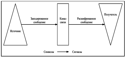 Коммуникация как действие ее модель представлена на рис. 2. В этой модели источник коммуникации разрабатывает послание, состоящее из символов. Символы затем превращаются в сигналы, или кодируются. Сигналы посылаются через каналы для получателя информации, который их расшифровывает или интерпретирует. Модель также включает звук, который влияет на процесс. Модель, представленная на рис. 2, первоначально применялась к электронной коммуникации, однако использовалась также для описания коммуникации между людьми. Коммуникация рассматривалась как односторонний процесс. В этой модели нет места для обратной связи.