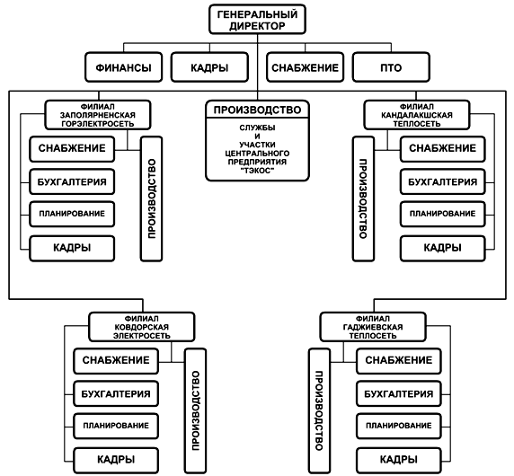 После преобразования структуры предприятие состоит из центрального предприятия (г. Мурманск, участки Кольского района, участки Ловозерского района) и филиалов (филиал Заполярненская горэлектросеть, Ковдорская электросеть, Кадалакшская теплосеть, Гаджиевская теплосеть)(Рис. 9).