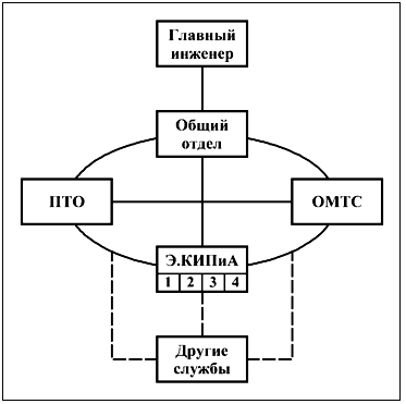 Структура коммуникационной связей электротехнической службы имеет модель взаимодействия в следствии того, что главный инженер на любом этапе планирования контролирует процесс сбора данных и обобщения. Этот контроль выполняет функцию дополнительной обратной связи который позволяет ему в принятии решения которым является утверждение плана проведения ремонтных и пуско-наладочных работ или необходимостью его доработки по каким либо позициям.