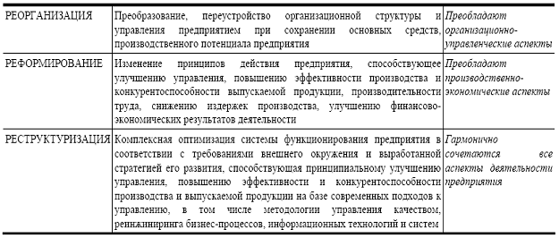 Реструктуризация соотносится с предприятием как с бизнесом (хозяйственный объект), тогда как реформирование более традиционно связывается с предприятием как хозяйствующим субъектом. Реорганизация, в свою очередь, чаще всего понимается в более узком смысле слова – как структурное преобразование предприятия или группы предприятий.