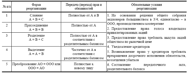 Формами реорганизации являются: слияние и присоединение, разделение и выделение, преобразование (табл. 2).
