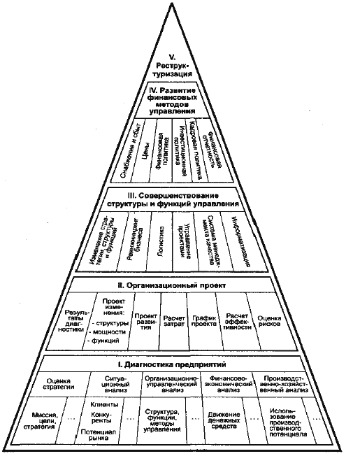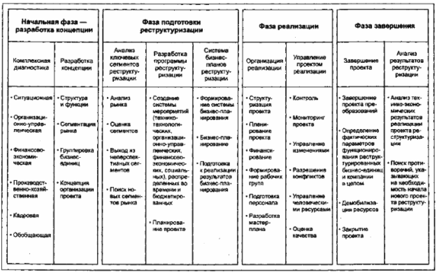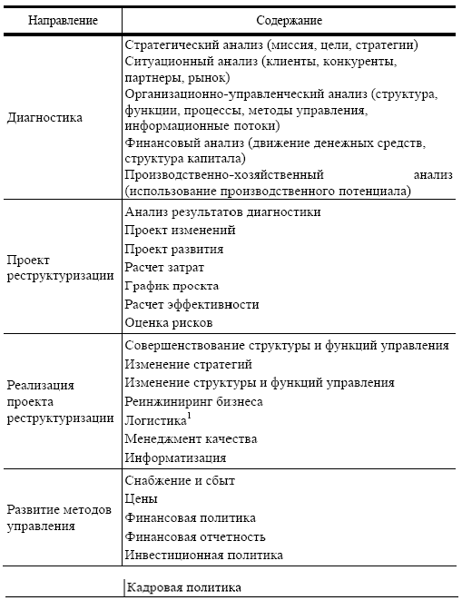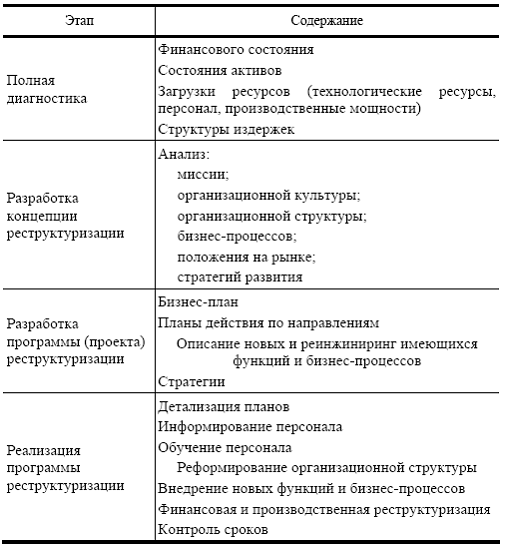 Реструктуризация подразумевает системный характер оптимизации функционирования компании. Она включает многоаспектный и взаимоувязанный комплекс мероприятий, процессов, методов, начиная с комплексной диагностики компании и до реорганизации как организационной структуры, так и бизнес-процессов на базе современных подходов к управлению, в том числе методологии управления качеством, реинжиниринга бизнес-процессов, информационных технологий и систем.