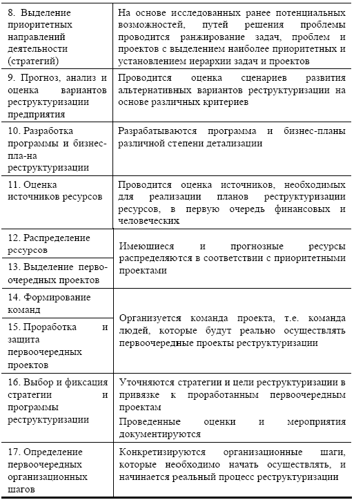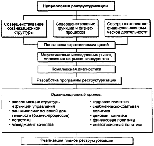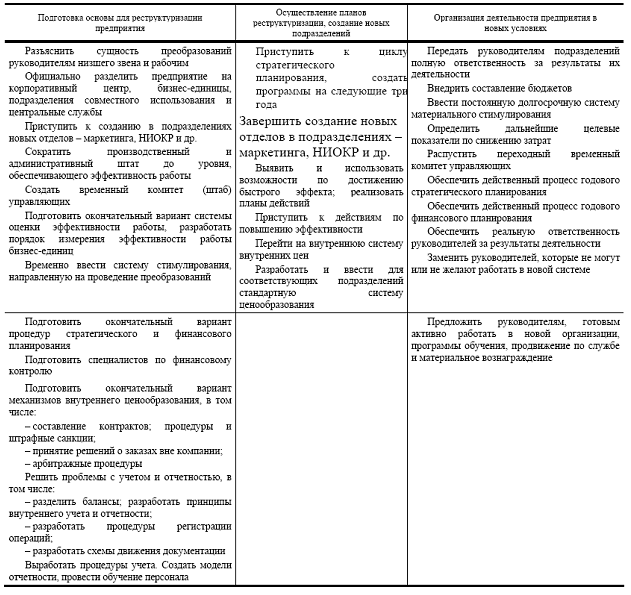 Реструктуризация обычно приводит к ликвидации убыточных производств, созданию новых функциональных служб, хозяйственному обособлению технологически мало связанных друг с другом подразделений, концентрации ресурсов и усилий на стратегически перспективных направлениях.