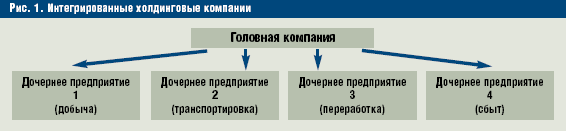 1. интегрированный, в котором предприятия связаны технологической цепочкой (рис. 1). Данный тип холдингов получил широкое распространение в нефтегазовом комплексе, где под руководством головной компании объединены предприятия по добыче, транспортировке, переработке и сбыту продукции. Например, в ОАО "Татнефть" создано более 100 самостоятельных юридических лиц в форме дочерних предприятий, среди которых непосредственно производственно-технологическим процессом связаны 44 (12 - разведка и добыча нефти и газа, 20 - производство нефтяного оборудования, 12 - переработка и сбыт нефти), 26 предприятий занимаются инвестиционной и финансовой деятельностью, а 47 - сервисным обслуживанием.