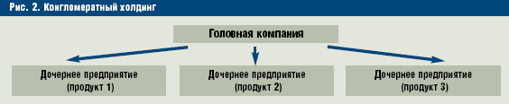 2. конгломератный, который объединяет разнородные предприятия, не связанные технологическим процессом. Каждое из дочерних предприятий ведет свой бизнес, ни в коей мере не зависящий от других дочерних фирм. В данный холдинг могут входить и производственные компании, и предприятия общественного питания, и рекламные агентства (рис. 2).
