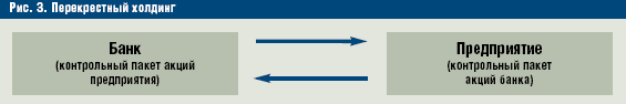 2. перекрестный, при котором предприятия владеют контрольными пакетами акций друг друга (рис. 3). Такая форма холдингов характерна для Японии, где банк владеет контрольным пакетом акций предприятия, а оно обладает контрольным пакетом акций банка. Таким образом, происходит сращивание финансового и промышленного капитала, что, с одной стороны, облегчает предприятию доступ к финансовым ресурсам, имеющимся у банка, а с другой стороны, дает банкам возможность полностью контролировать деятельность дочерних предприятий, предоставляя им кредиты.