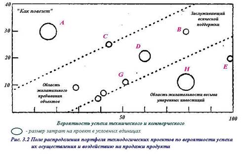 На этой схеме каждый проект характеризуется предполагаемым воздействием на продажи и вероятностью успеха, под которым понимают произведение оцененных вероятностей технического и коммерческого успеха. Размер кружков пропорционален необходимым техническим усилиям и требуемым ресурсам. Понятно, что проекты, попадающие в правый верхний угол, должны финансироваться и всячески поддерживаться в первую очередь, а находящиеся в левой нижней части - приостанавливаться или, по крайней мере, тщательно контролироваться и адекватно финансироваться.