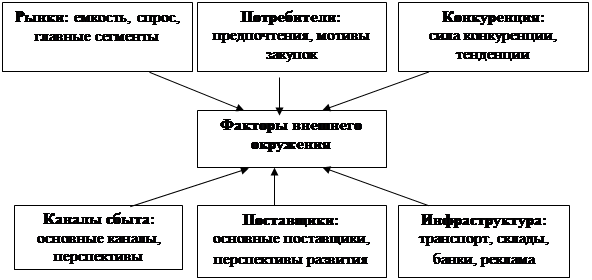 Таким образом, внешняя среда предприятия заключает в себе множество факторов, важнейшими из которых являются международные, национальные, экономические, демографические и рыночные. В число последних входят психология потребителя, новизна конструкций, технологий и конкурентоспособность продукции, а также формы конкуренции и система маркетинга.