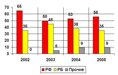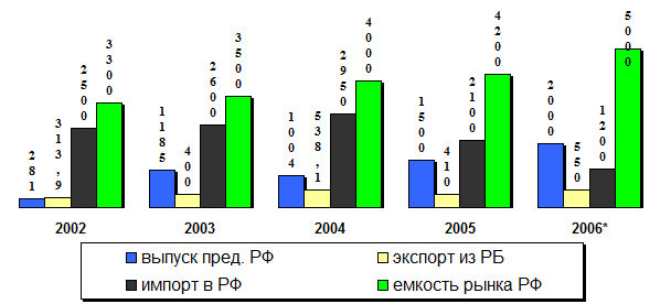 Последняя строка таблицы характеризует величину предложения на товарном рынке телевизоров РФ. Принимая величину товарных запасов в торговле 5-7% от величины удовлетворенного спроса (по-аналогии с рынком РБ), тенденции изменения величины предложении правомерно переносить на изменение величины удовлетворенного спроса. В 2002 году величина предложения возросла на 21,7% к уровню 2001 года, что, по всей видимости, связано с ростом спроса. Рост предложения в 2002 году происходил за счет роста импорта, как из РБ, так и из третьих стран. При этом величина экспорта из РБ и собственного производства российскими предприятиями составляла 10,0% и 10,1% от общей величины предложения, соответственно, т.е. были незначительными. Принимая во внимание увеличение производства телевизоров в РФ в 2003 году до 1 185 тыс. шт. (в 4,2 раза к 2002 году), а так же увеличение экспорта телевизоров из РБ в страны СНГ, можно предположить, что спрос на продукцию отечественного производства существенно возрос и увеличение спроса в РФ будет происходить за счет данной продукции.