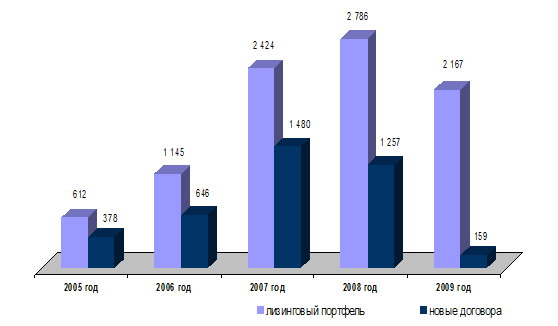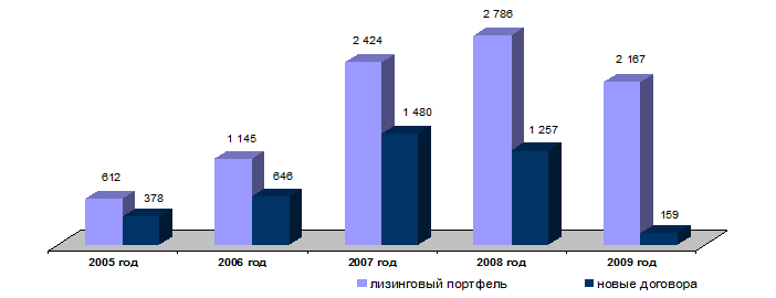 Диаграмма 1. Показатели деятельности компании «ПН-Лизинг» 2005 - 2009 г.г., млн. руб. [21].
