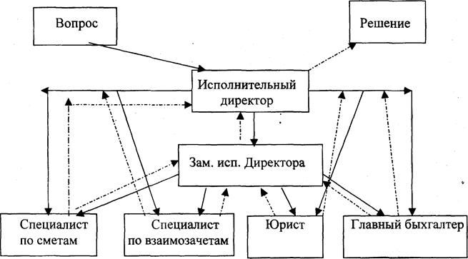 Например, привезли из района смету расходов на строительства молодежного центра г. Курчатова за счет средств инвестфонда. Исполнительный директор дает задание специалисту по сметам, тот в свою очередь осуществляет быстрый и правильный анализ сметы расходов, представляемых на согласование исполнительной дирекции. Специалист напрямую работает с исполнителем и заказчиком сметы расходов. И дает заключение завышена смета расходов или нет. А исполнительный директор уже принимает решение пропустить смету или нет.