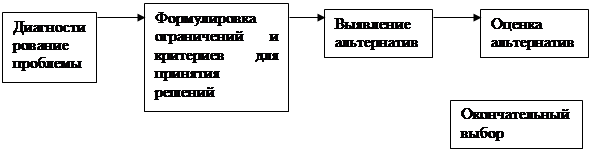 Принятие решения представляет собой сознательный выбор среди имеющихся вариантов или альтернатив направления действий, сокращающих разрыв между настоящим и будущим желаемым состоянием организации. Таким образом, данный процесс включает много различных элементов, но непременно в нем присутствуют такие элементы, как проблемы, цели, альтернативы и решения.
