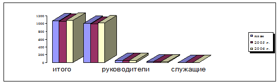 Как видно из табл. 5, фактическое количество работников по категориям в 2005 г. не соответствовало плановым данным – численность рабочих была ниже запланированной на 1004-991 = 13 человек (1,3%), по остальным категориям штат предприятия укомплектован полностью. В 2006 г. численность персонала по категории рабочих даже превысила плановые данные на 14 человек или на 1,4%. Численность всех остальных категорий работников в 2006 г. соответствовала данным плана. Представим полученные данные в виде диаграммы (рис. 2).