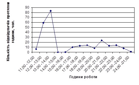 Отже, найбільше відвідувачів з 11-00 до 13-00 год., що співпадає з організацією сніданків та ленчів у даному закладі. Потім з 13-00 до 15-00 год., обідній період, з більш менш нормальною кількістю відвідувачів. Та з15: 00 до 16: 00 немає жодного відвідувача, а далі ввечері та до 01-00 год. спостерігається відносно невелика кількість відвідувачів з піком о 20-00 годині. Так можна зробити висновок, що працювати закладу після 16 години не зовсім доцільно, та не вигідно. Проте, з часом такі тенденції відвідування покращуються і збільшується кількість клієнтів в час „застою" закладу.