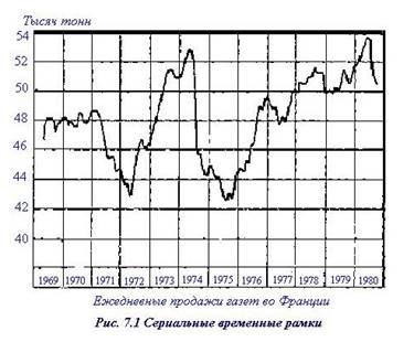 Видна общая тенденция к увеличению на фоне больших и меньших циклов сезонных и других изменений. Существующие программные средства “смещения среднего”, экспоненциального сглаживания, многофакторного регрессионного анализа и др. позволяют получить сглаженную кривую, в частности, для прогнозирования в приведенном примере изменения потребления газет и за пределы 1980 года.