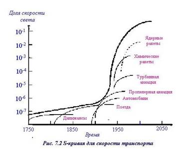 На рис.2 представлено семейство кривых для отдельных технологий, характеризующих развитие средств перемещения, где скорость движения оценивается в долях от скорости света. Обобщенная кривая дает картину изменения скорости перемещения, асимптотически приближающейся со временем к скорости света. Во многих моделях прогнозирования технологий существуют такие физические или естественные ограничения, как, например, доля рынка, которая не может быть более 100%.