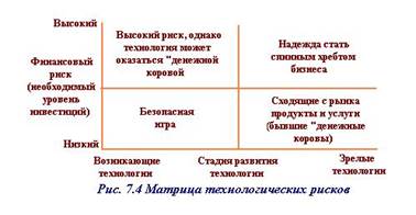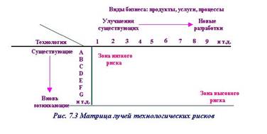 Анализ портфеля. Этот метод относится к методам анализа финансовых рисков, сопровождающих планирование технологий, и будет более подробно рассмотрен в курсе “Управление рисками”. Строго говоря, он не является методом технологического прогнозирования, потому что не содержит оценок будущих разработок или параметров технологии. Однако это важный инструмент планирования, с помощью которого оценивают риск бизнеса (соотношение инвестиций и возможной отдачи) новых разработок технологий и/или продуктов.
