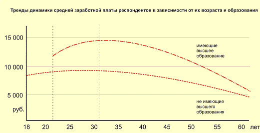 Приложение 3. Тренды динамики средней заработной платы респондентов в зависимости от их возраста и образования