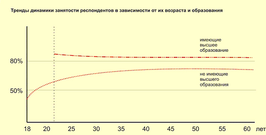 Приложение 4. Тренды динамики занятости респондентов в зависимости от их возраста и образования