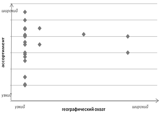 Рисунок 1. Точечная диаграмма «широта ассортимента – географический охват»
