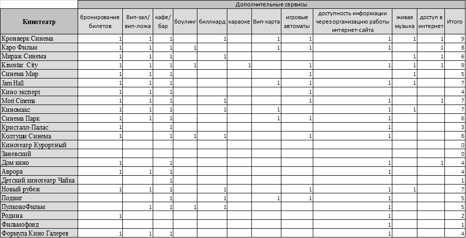 Проведем анализ основных игроков санкт-петербургского рынка кинопоказа с учетом выбранных критериев. Результаты анализа представлены в Таблице 3 и Таблице 4.