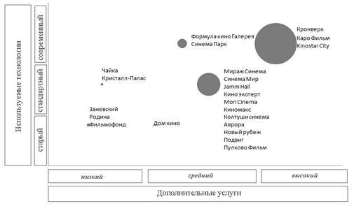 Таким образом, все кинотеатры Санкт-Петербурга можно распределить в шесть стратегических групп по критериям «технологии – дополнительные сервисы». В отношении технологий данная ситуация объясняется необходимостью больших инвестиций. Такие инвестиции даются легче и быстрее окупаются у больших сетевых компаний или мультиплексов за счет экономии на масштабе и разнообразии, сложившегося портфеля и других преимуществ сетевых организаций. Что же касается предоставления дополнительных услуг, то нужно сразу оговориться, что лишь небольшая часть из них предоставляется самими кинотеатрами, остальные же могут зависеть от месторасположения и места аренды. Таким образом, кинотеатры, размещающиеся в ТРЦ, оказываются в более выгодном положении. Чем те, кто арендует собственное здание – в такой ситуации им приходится самостоятельно организовывать доп.услуги, соответственно их издержки возрастают. Также интересным показался факт, что компании находящиеся в группах с низкими технологиями и низким значением показателя доп. Услуг достаточно старые и в отзывах их тоже описывают как «кинотеатры нашего детства, кинотеатры советского периода». Кроме того, 2 кинотеатра Заневский и Фильмофонд относятся к кинотеатрам ГУК "Петербург-кино". Возможно, какую-то роль играет и стиль менеджмента.