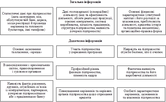 Підрозділи безпеки при проведенні кредитних операцій, як правило, здійснюють інформаційно-аналітичне їх забезпечення. Враховуючи вищезазначені критерії, безпосередньо на етапі підготовки до видачі і при видачі кредиту підрозділи безпеки здійснюють інформаційно-аналітичне дослідження позичальника, змістом якого є формування характеристики позичальника та його діяльності. Така характеристика включає два розділи: загальний і спеціальний. Загальний розділ містить такі відомості про позичальника: