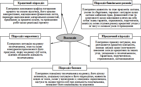 Кредитні підрозділи банків контролюють виконання графіка погашення кредиту та сплати відсотків, його цільове використання, фіксують наявність затримок у наданні банку відомостей і звітів, проводять аналіз поточної фінансової документації. Крім того, кредитними підрозділами періодично проводяться перевірки безпосередньо на підприємстві позичальника, зокрема перевіряється надходження матеріальних цінностей, придбаних за позичкові кошти, реальність виробничої діяльності щодо реалізації бізнес-проекту. Підрозділи безпеки у ході кредитного моніторингу здійснюють контроль поведінки позичальника, його ділової активності, появи нових комерційних зв’язків, загального режиму діяльності підприємства (кадрові зміни, конфліктні ситуації, зміни в організації виробництва тощо), наявність негативних відгуків про діяльність підприємства чи його власників або керівництва в засобах масової інформації, поведінки керівників і засновників (власників) підприємства, їх ставлення до стану і перспектив діяльності підприємства. Підрозділи безпеки також тримають у полі зору соціальну ситуацію на підприємстві, його взаємовідносини з правоохоронними органами й особливо податковою службою. Юридичні підрозділи здійснюють контроль правової ситуації з питань кредитування та вживають заходів щодо захисту інтересів банку у разі її змін. Крім того, вони забезпечують контроль дотримання позичальником обумовлених у договорах умов виконання зобов’язань та відповідно до рішень керівних органів банку здійснюють юридичне оформлення змін виконання сторонами своїх зобов’язань або умов їх забезпечення. Підрозділи банківських ризиків насамперед здійснюють вивчення ситуації щодо стану забезпечення повернення кредиту. Зокрема, з питань, що стосуються застави: чи не перезаставлено предмет застави, умови зберігання і стан предмета застави, чи не реалізовано (замінено), украдено предмет застави, дотримання передбачених договорами умов використання (експлуатації, оновлення) предметів застави. Якщо у заставі перебувають майнові права позичальника, під- розділи банківських ризиків контролюють терміни і ситуацію, коли ці майнові права позичальника перетворюються у конкретну про- дукцію, і вживають заходів щодо прийняття останньої в заставу.