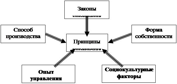 Как видно из схемы на содержание принципов управления оказывают существенное влияние не только известные современной науке законы управления и накопленный опыт. К факторам, определяющим принципы менеджмента можно отнести и существующие на данный момент времени способы осуществления производственной деятельности, форма собственности на средства производства, а также социо-культурные факторы.