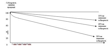 Рис. 1.3. Порівняльний вплив на собівартість одиниці продукції ефекту кривій Досвіду, рівного 10%, 20%, 30%, при подвоєнні кумулятивного випуску продукції