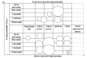 Але для того щоб забезпечити собі тривалий характер подібної переваги, необхідно враховувати життєві цикли різних стратегічних зон господарювання фірми. Метод БКГ дозволяє на основі вивчення видів діяльності компанії скласти оптимальний портфель цих видів діяльності, а також оцінити позиції конкуруючих фірм по відношенню друг до друга. Це один з методів матричного аналізу, що базується на використанні матриці господарського портфеля. Дана матриця являє собою таблицю, у якій зіставляються стратегічні позиції кожного структурного підрозділу диверсифікованої компанії (рис. 1.2).
