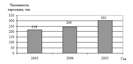 Численность работников предприятия составила: в 2003 году – 219 человек; в 2004 – 244; в 2005 – 305 человек. Динамика численности персонала ООО "Мегатавр" представлена на рис. 2.