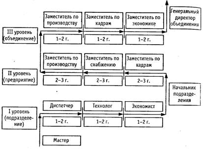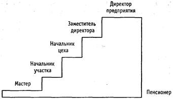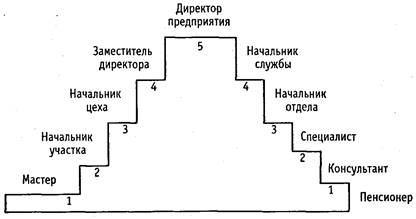 Модель карьеры «лестница» предусматривает, что каждая ступенька служебной 1 карьеры представляет собой определенную должность, которую работник занимает фиксированное время, например, не более 5 лет. Такого срока достаточно для того, чтобы войти в новую должность и проработать с полной отдачей. С ростом квалификации, творческого потенциала и производственного опыта руководитель или специалист поднимается по служебной лестнице (рис. 2). Каждую новую должность работник занимает после повышения квалификации.