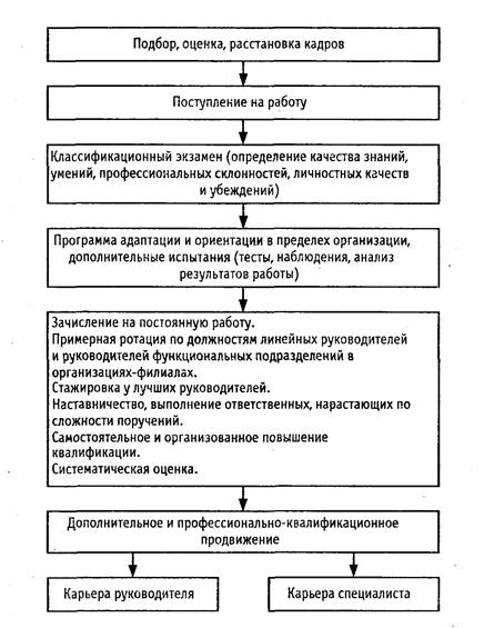 Управление карьерой работников в определенной степени является естественным продолжением и результатом всей деятельности службы управления персоналом. Данный процесс начинается уже на этапе найма, в ходе которого претенденту должна быть представлена полная и достоверная информация о возможностях и перспективах работы в фирме. Хорошо продуманная и организованная программа подготовки и повышения квалификации работников обусловливает реализацию планов по построению карьеры: повышение в должности, перемещение и т.п.