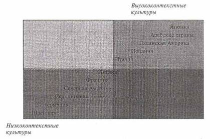 Чисто лингвистические коммуникации, вне зависимости от их эмоциональной нагрузки, низкоконтекстны. Однако многое в деловых коммуникациях зависит от невербальной части сообщений. В некоторых культурах вербальное сообщение точно и определённо, слова передают основную информацию. В других культурах слова несут меньшую смысловую нагрузку, так как смысл завуалирован в контексте. Профессор антропологии Е.Т Холл разделил культуры на высококонтекстные и низкоконтекстные. Он проранжировал их по степени преобладания контекста (рис. 1).