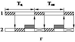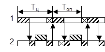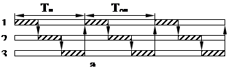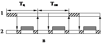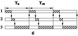 Такая ситуация возникает при циклическом обслуживании станков, имеющих не равную, но кратную длительность операций (рис. 1в).