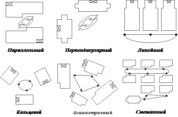 Важным элементом эффективной организации многостаночного обслуживания является рациональная планировка, обеспечивающая кратчайший маршрут перемещения рабочего от станка к станку, хороший обзор всей группы оборудования. Размещение оборудования осуществляется в каждом конкретном случае в зависимости от особенностей оборудования и формы его обслуживания. На рис. 2 представлены типовые планировки рабочих мест и их применимость при многостаночном обслуживании.