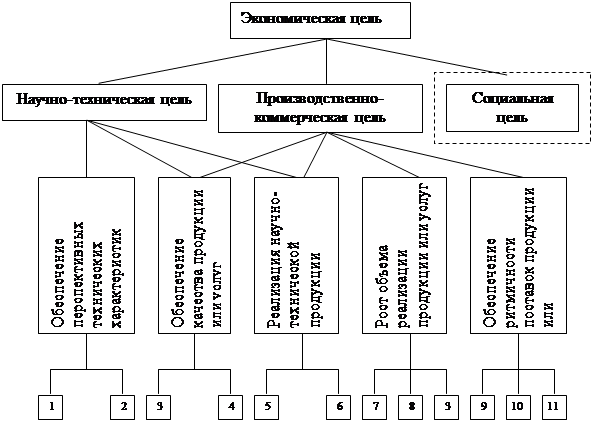 Экономическая цель – получение расчетной величины прибыли от реализации продукции или услуг; научно-техническая цель – обеспечение заданного научно-технического уровня продукции и разработок, а также повышение производительности труда за счет совершенствования технологии; производственно-коммерческая цель – производство и реализация продукции или услуг в заданном объеме и с заданной ритмичностью (обеспечивающие экономическую цель договорные обязательства, госзаказы и т.п.); социальная цель – достижение заданной степени удовлетворения социальных потребностей работников.